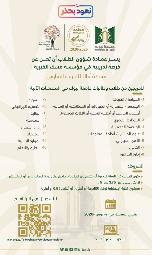 جامعة تبوك Twitterissa إعلان يسر عمادة شؤون الطلاب ب جامعة تبوك أن تعلن عن فرصة تدريبية في مؤسسة مسك الخيرية مسك أمالا للتدريب التعاوني للخريجين من طلاب وطالبات جامعة تبوك في التخصصات الموضحة وحسب الشروط الواردة